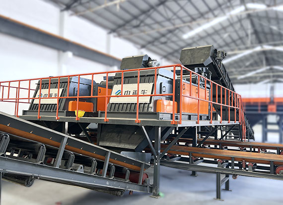 破碎線主機殼體采用特厚鋼板制造,內襯為高錳鑄鋼件,可更換;主機轉子盤安裝于水平軸上,轉子盤圓周分布有銷軸,軸向懸有錘頭;主軸用滾珠軸承支撐,循環油強制潤滑冷卻,并裝有溫度傳感器;進料口裝有液壓輥筒喂料裝置,位置一高一低,同向旋轉,能將大件松散物料壓扁,送入破碎腔內。